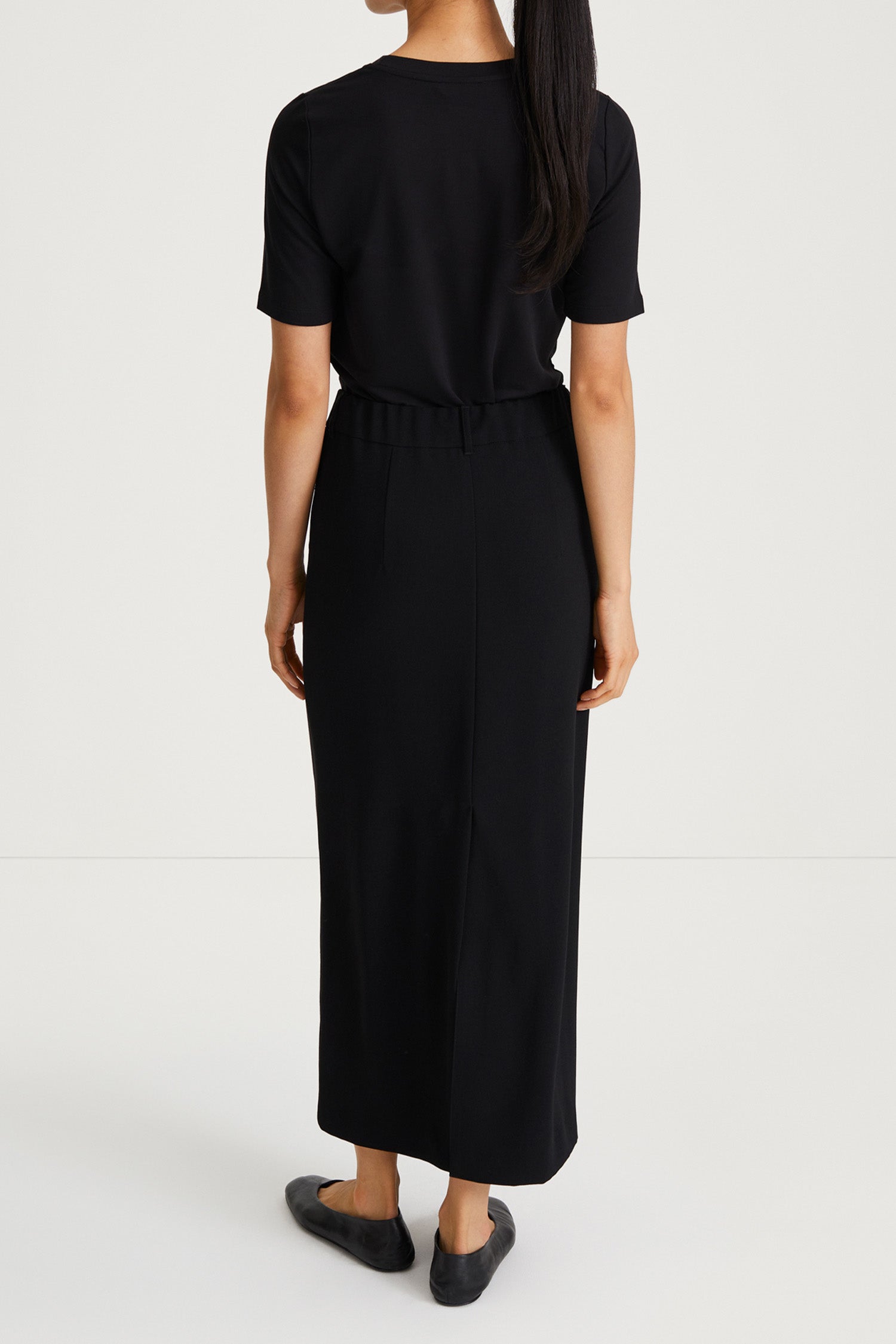 Berkeley - the perfect office-wear skirt made from luxurious Crepe material. The skirt is calf-length, has a straight fit, and is fully lined. It features a waistband with wide elastic inside at the back, ensuring a tailored fit. The skirt has a discreet slit at the back and closes with a zipper.