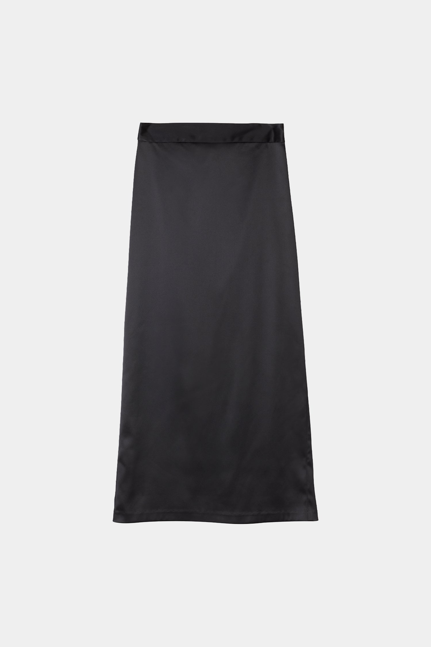 The Bondeno skirt is an elegant ankle-length straight skirt in a satin fabric featuring a comfortable elastic waistband, a back slit, and a sleek side-seam zipper.