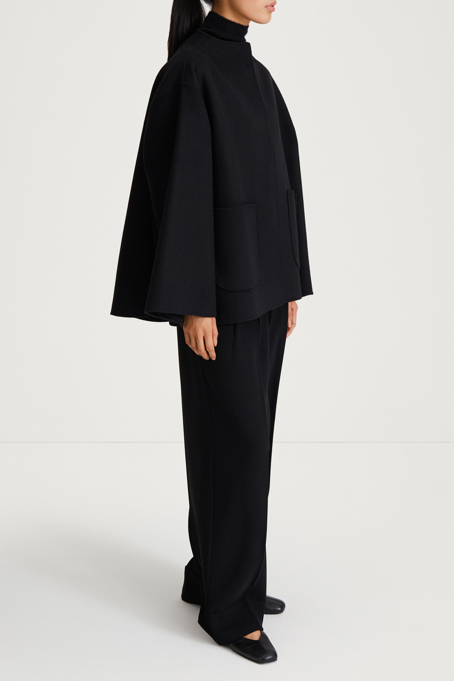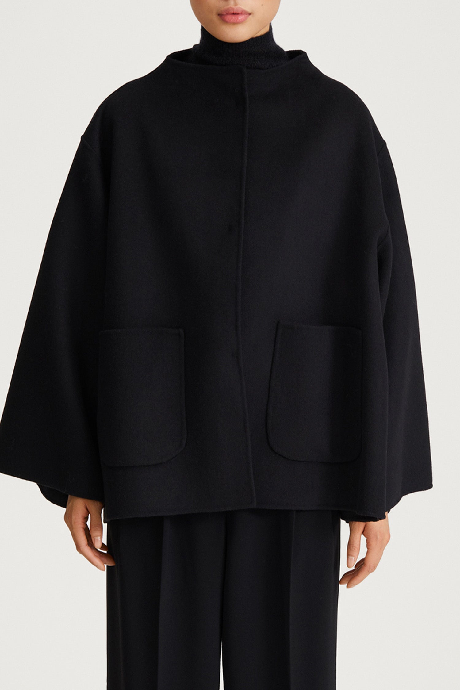 Tritsis Jacket is a voluminous flared jacket in a luxurious double-face wool blend. Featuring the Stylein signature box-pleat at the back, a sleek one-piece collar stand, and full-length wide sleeves. The front patch pockets and invisible three-piece button closure add functional elegance. Perfect for any occasion.
