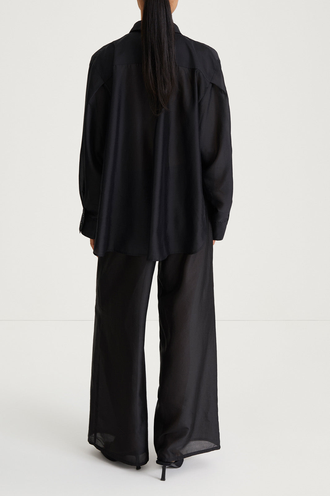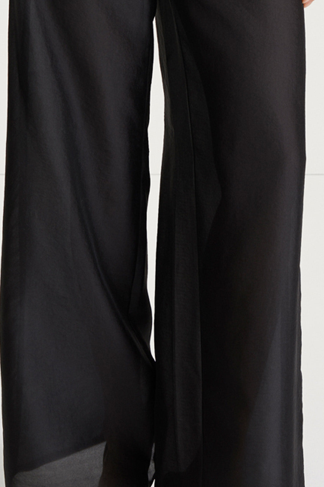 These high-waist, wide-leg trousers are crafted from a sheer, lightweight fabric that creates a fluid silhouette. Designed with a comfortable elastic waistband, the trousers are unlined, offering a transparent look.