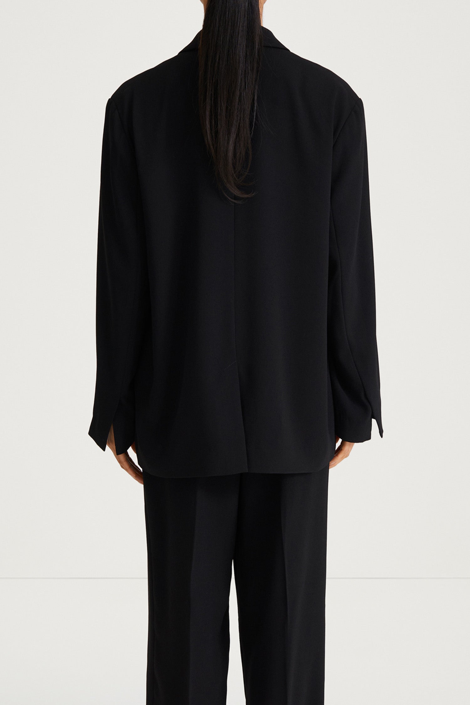 Breena is a double-breasted blazer crafted from a crepe fabric with a loose fit. Fully lined and designed with full-length sleeves featuring subtle slits at the cuffs, it also showcases a refined semi-stand collar and delicate shoulder pads for a structured silhouette. The front is detailed with lengthwise seams and framed waist pockets, while four tonal buttons complete the closure.