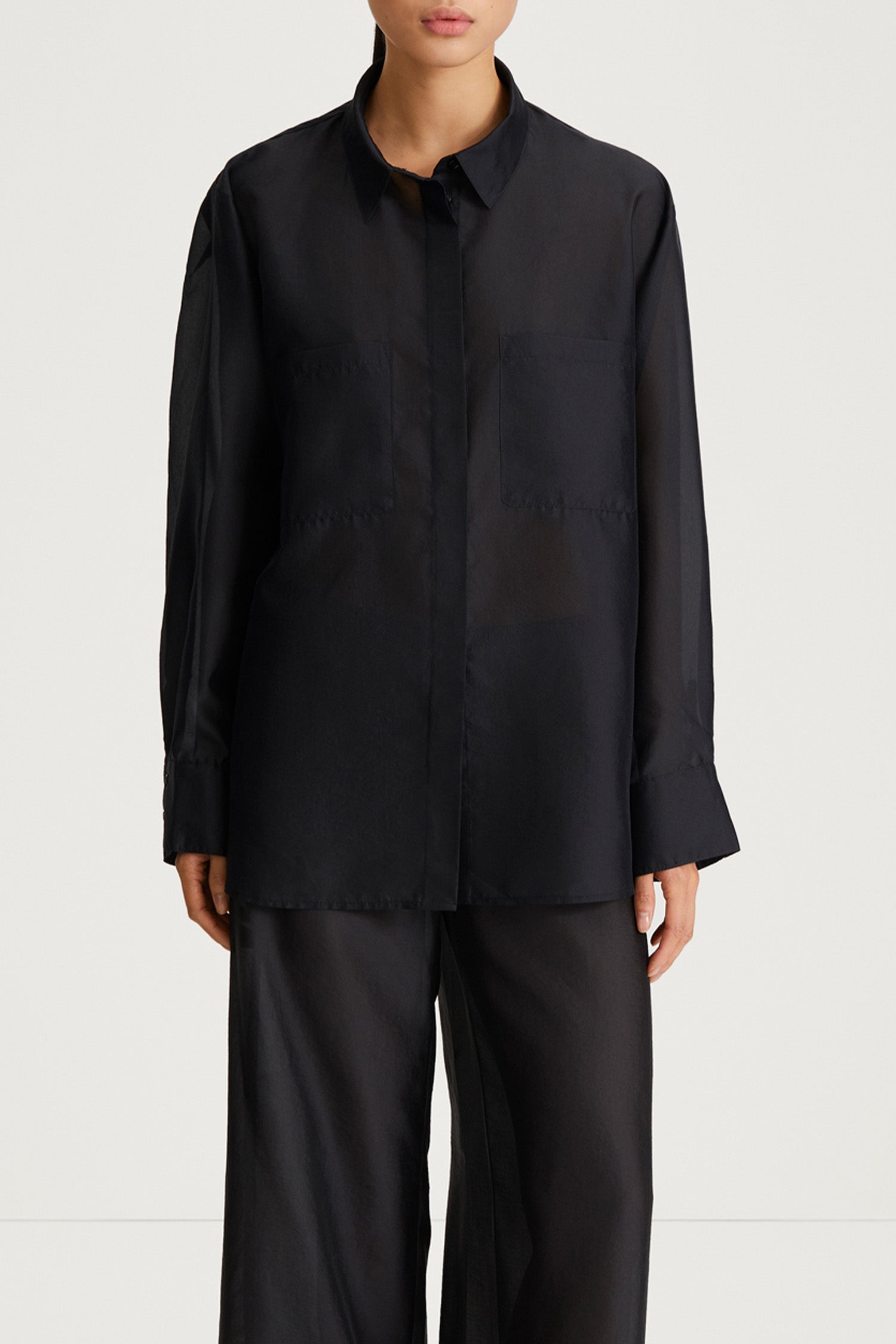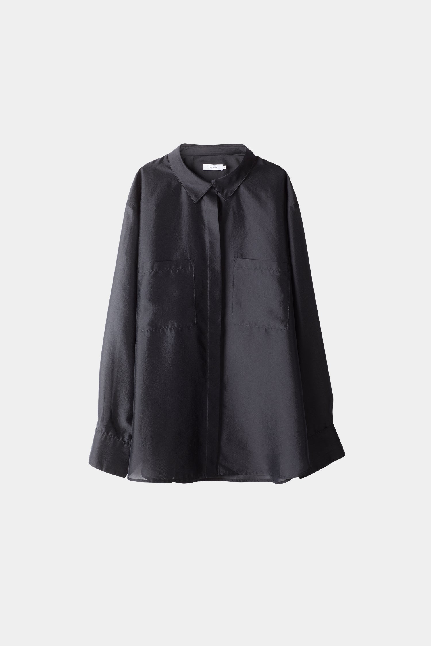 This loose-fit shirt is crafted from a sheer, lightweight fabric. It features Stylein’s signature back yoke with a box pleat, along with full-length wide sleeves and a structured collar with collar stand. Two patch pockets at the front complete the design.